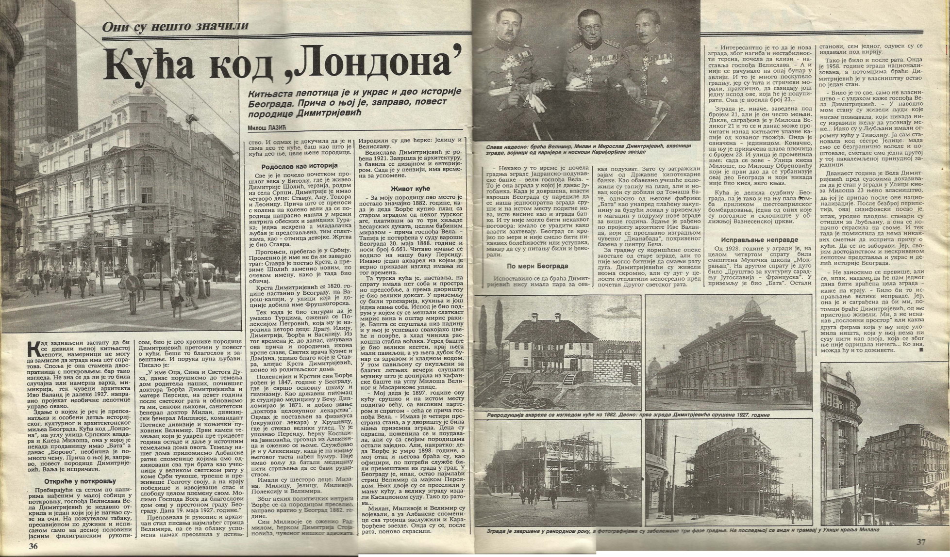 За мене прича постаје интересантнија десетак година касније, када сам се сасвим случајно, приликом повратка са неког славља, у превозу упознао са старијом госпођом и провео време у разговору док нисмо заједно изашли код "Лондона". Тада је она кренула ка улазу и онда сам схватио да је у питању ћерка ђенерала Димитријевића, госпођа Вела Димитријевић. Наравно да смо провели још неких пола сата на новембарској хладноћи причајући о историји зграде а и предратног ратног и поратног Београда. Иначе госпођа Димитријевић је архитекта, једна њена скулптура од армираног бетона се налази поред самог шеталишта поред Топчидерске реке близу дрвеног мостића, а интересантно је и то да је учествовала у прављењу филма "Чудотворни мач" (1950) као део сценографског тима и то у осмишљавању сцене када Баш-Челик (Миливоје Живановић) кида обруч по обруч и ослобађа се из бурета. Нажалост, никада се касније нисам срео са госпођом Димитријевић, надам се да је жива и да је здравље служи јер је свакако део овог - Београда кога више НЕМА.