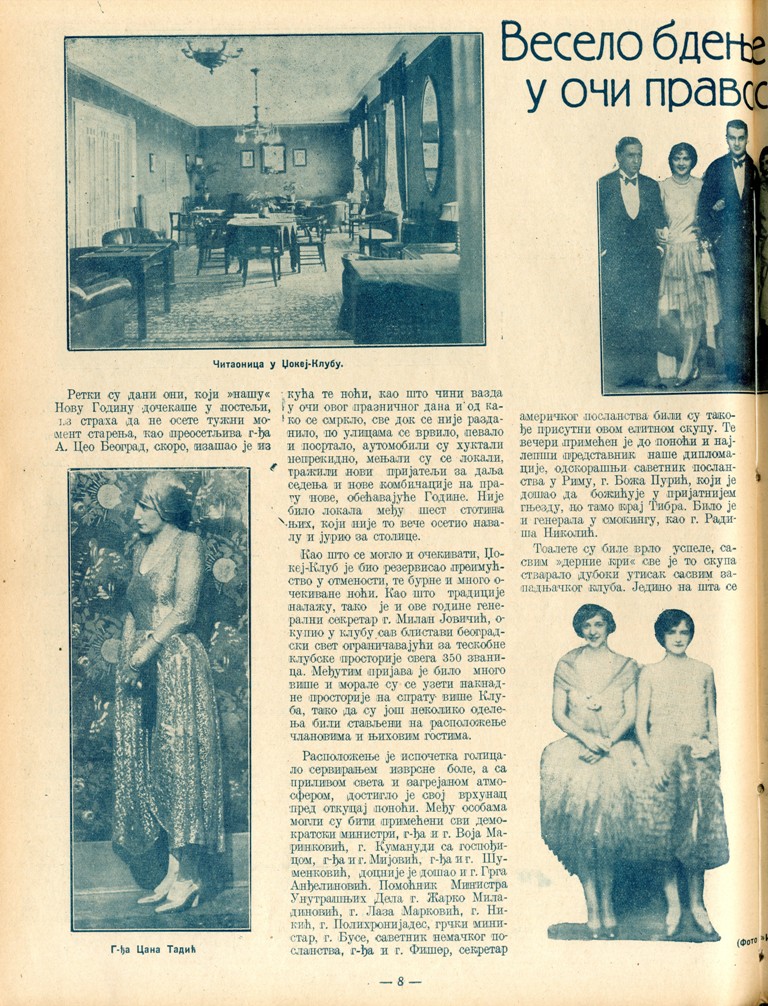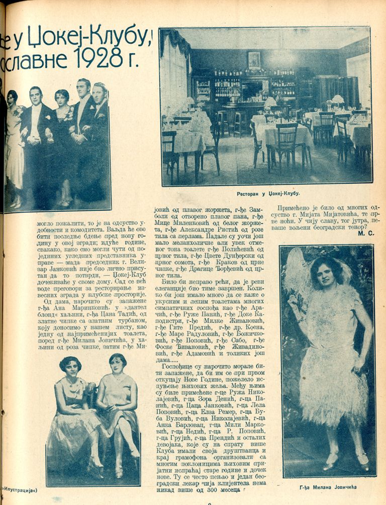 Госпођице су нарочито морале бити запажене, да би им се при првом откуцају Нове Године, пожелело испуњење њихових жеља. Међу њима су биле примећене г-це Ружа Николић, г-ца Зора Денић, г-ца Панић, г-ца Цаца Јанковић, г-ца Лела Поповић, г-ца Елза Ремер, г-ца Буба Вуловић, г-ца Николајевић, г-ца Анка Барловац, г-ца Мили Марковић, г-ца Недић, г-ца Р. Поповић, г-ца Грујић, г-ца Прендић и осталих девојака, које су на спрату више Клуба имали своја друштванца и крај грамофона организовали са многим поклоницима њиховим пријатан испраћај старе године и дочек нове. Ту се често пењао и један београдски лекар чија клијентела нема никад више од 300 месеца. Примећено је било од многих одсуство г. Мијата Мијатовића, те прве ноћи. У чију славу, тог јутра, певаше вољени београдски тенор?