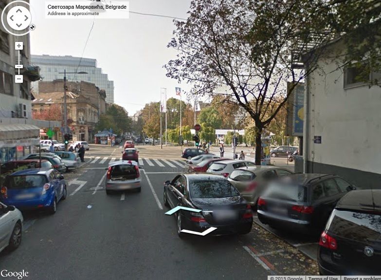 Извини, ипак је ово С. Марковића код Краља Милана. Отприлике овако, али нисам могао да се попнем на тротоар иза баште.