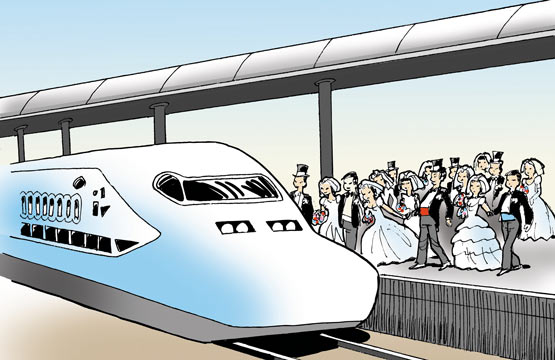 Јапанска железничка линија која кружи око Токија ове године слави сто четрдесет први рођендан. Као поклон суграђанима радници су предложили да се воз претвори у место за венчања. Композиција има једанаест вагона. Младенцима и њиховим гостима на располагању би био читав воз. Свадбе би трајале око сат и по, колико и иначе траје вожња овом линијом. Воз би се током венчања заустављао на свакој станици, али се врата не би отварала. Једини недостатак оваквог венчања засад је то што возови немају тоалет, али, без обзира на то, парови се јављају и унапред резервишу датум склапања брака.