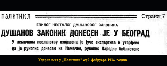 А онда је почетком новембра управник библиотеке Урош Џонић добио понуду књига из књижаре Густава Фока из Лајпцига. Крајње уобичајено, немачки књижар дошао је у посед књига које тамо и нису толико важне, али овде... На списку се налазила и књига која је изазвала посебну Џонићеву пажњу. По крајње штуром опису, нањушио је да је могуће да је у питању Призренски рукопис Душановог законика. О својој сумњи одмах је обавестио Министарство просвете и Академију наука. Оно што је будило сумњу био је прилично штур опис саме књиге. Навођено је да је у питању потпуно нов препис Законика, до сада неоткривен. То би само по себи било сензација првог реда.