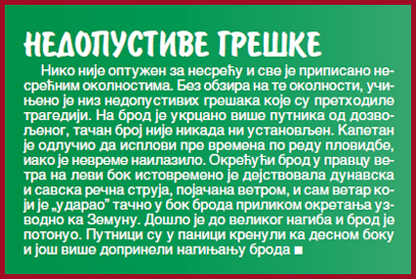 – Био сам добар пливач и нисам се успаничио – сећа се Гркинић. – Имао сам на себи штофане панталоне и летњу кошуљу, на руци сат, а у џепу пенкало, поклон од мајке за положену матуру. Признајем да сам у том тренутку више размишљао о томе како да не изгубим драгу успомену, него како ћу се докопати обале. Око мене је било много људи, неке даске су пловиле, дављеници су се панично хватали за њих, на све стране су пловиле разбацане ствари. Река је врила од удара кише и праћакања немоћних људи, којих је око мене било на десетине. Почео је да пада и страховито велики град, леденице су нам буквално разбијале главу, а спасао ме је нечији шешир који сам нашао у води. Жао ми је што га нисам сачувао за успомену, али и данас имам сат на коме су казаљке остале поклопљене, тачно у тренутку када је брод потонуо.