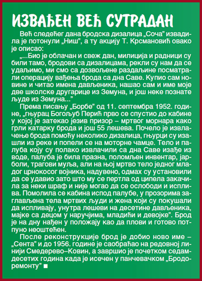 Почетком септембра 1952. године Савски мост је био затворен за саобраћај због обнове, па се у Земун из Београда и натраг ишло бродом или аутобусима који су долазили до моста, а путници су га затим прелазили пешице. Међутим, тога дана мост је био затворен и за пешаке, па је путницима преостао једино бродски превоз. Речни саобраћај су тада обављали бродови „Загреб” и „Ниш”, капацитета до 60 путника, који су тих дана, због отежаног друмског саобраћаја, превозили знатно већи број путника од дозвољеног.