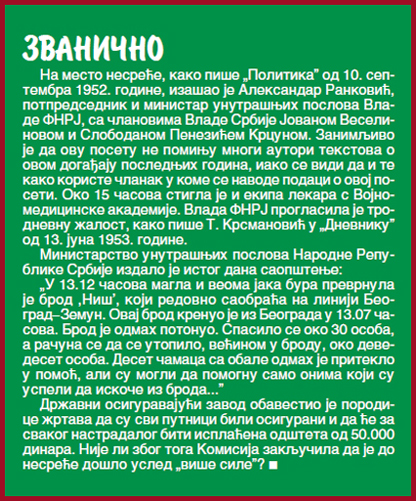 – Било како било, „Ниш” је из београдског пристаништа испловио у 13 сати и 7 минута, али га је већ код Великог ратног острва, код ушћа рукавца Дунава у Саву, захватила олуја с кишом, градом и ветром који је дувао брзином већом од 100 километара на сат – сећа се Најхолд. – Један снажан талас га је нагнуо, па крманош Јован Гвоздић није успео да окрене прамац ка ветру, нити да брод приближи обали, како је гласила капетанова команда. Нови удар ветра преврнуо је брод у 13 сати и 12 минута, а само три минута касније завршио је на дну реке.