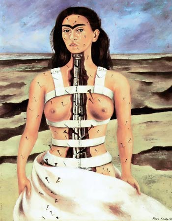 Морала је да слика јер је бол због Дијегових неверстава и њене болести био превелики да би остао само у њој. На једној фотографији видимо Фриду како лежи у болници и помоћу огледала исликава корсет. Има намазане нокте, прстење, фризуру… Опет пркоси. Током три године испробала је двадесет осам корсета од гипса, пластике, гвожђа и коже. Нашарати тај оклоп и кавез без кога би се њено тело распало не може свако.